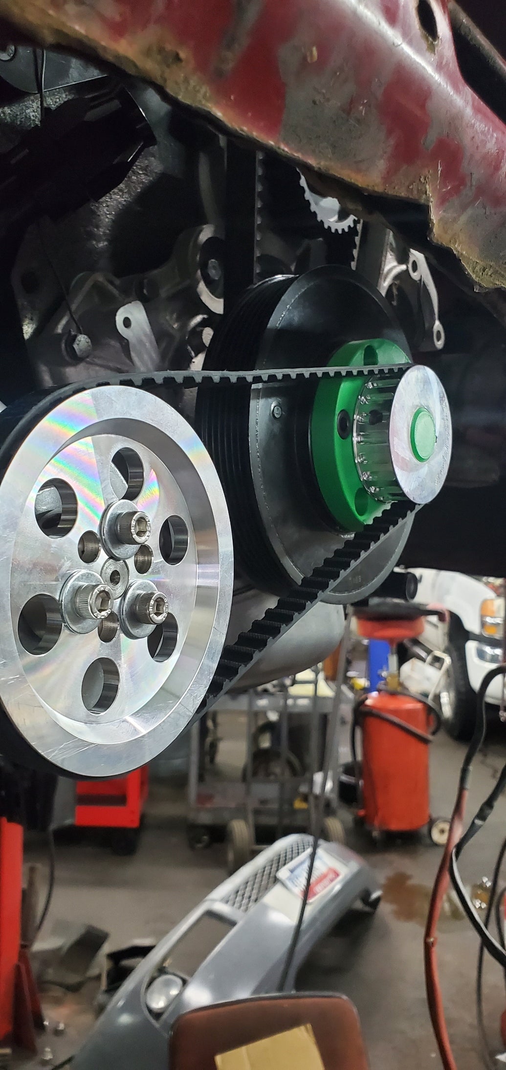 This setup uses a 27" gilmer belt (product # 05-0912). A crank pulley mandrel is currently in development to be used with iAbed's AAN fluidampr setup